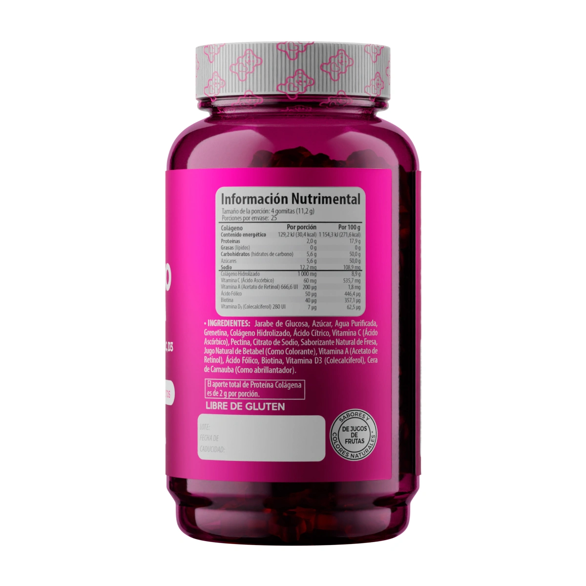 Jarabe de Glucosa, Azúcar, Agua Purificada, Grenetina, Colágeno Hidrolizado, Ácido Cítrico, Vitamina C (Ácido Ascórbico), Pectina, Citrato de Sodio, Saborizante Natural de Fresa, Jugo Natural de Betabel (Como Colorante), Vitamina A (Acetato de Retinol), Ácido Fólico, Biotina, Vitamina D3 (Colecalciferol), Cera de Carnauba (Como abrillantador).