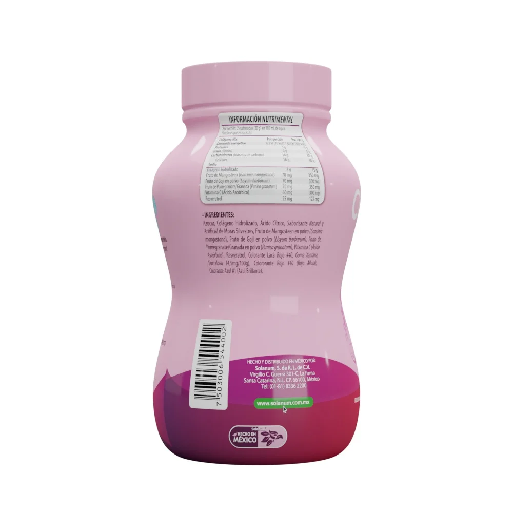Proteína colágena hidrolizada, Extracto de Acai (Euterpe oleracea), Extracto de Mangosteen (Garcinia mangostana), Extracto de Goji (Lycium barbarum), Pomegranate/Granada (Punica granatum), Resveratrol.