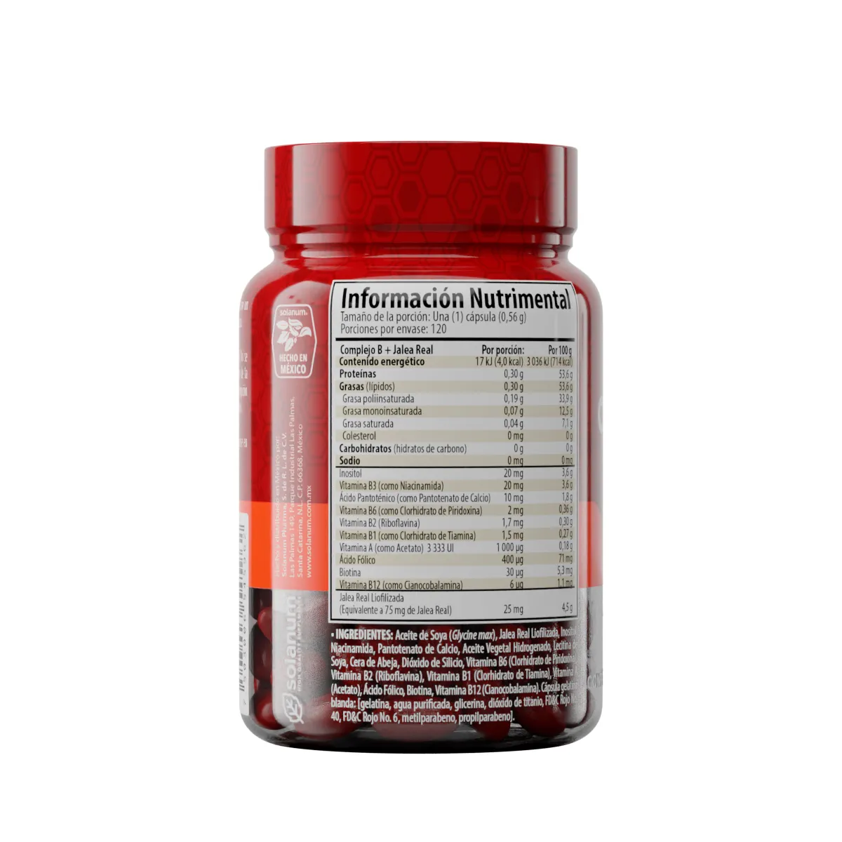 Aceite de Soya (Glycine max), Jalea Real Liofilizada, Inositol, Niacinamida, Pantotenato de Calcio, Aceite Vegetal Hidrogenado, Lecitina de Soya, Cera de Abeja, Dióxido de Silicio, Vitamina B6 (Clorhidrato de Piridoxina), Vitamina B2 (Riboflavina), Vitamina B1 (Clorhidrato de Tiamina), Vitamina A (Acetato), Ácido Fólico, Biotina, Vitamina B12 (Cianocobalamina). Cápsula gelatina blanda: [gelatina, agua purificada, glicerina, dióxido de titanio, FD&C Rojo No. 40, FD&C Rojo No. 6, metilparabeno, propilparabeno].