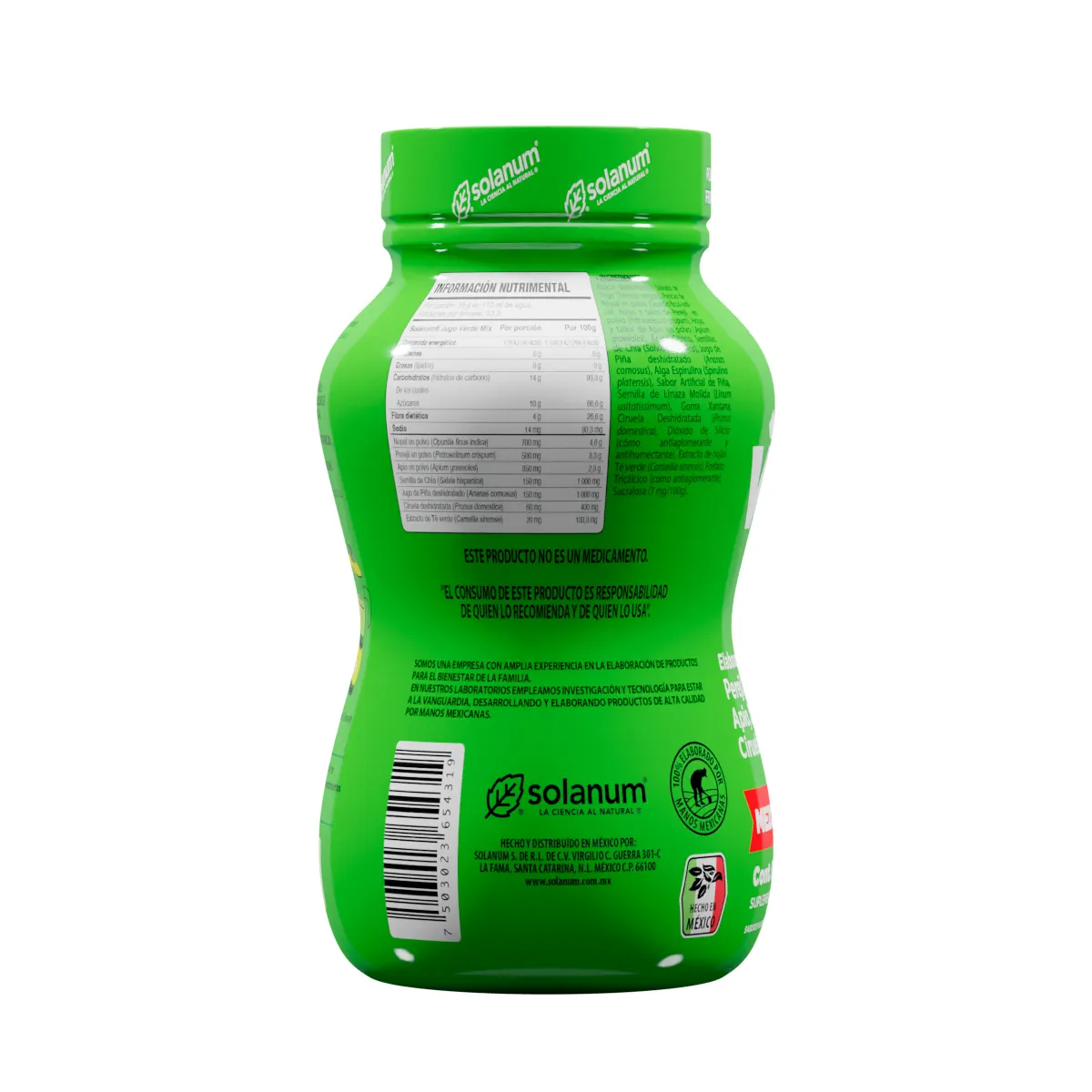 Azúcar, Maltodextrina, Salvado de Trigo (Triticum vulgare), Pencas de Nopal en polvo (Opuntia ficus-indica), Hojas y tallos de Perejil en polvo (Petroselinum crispum), Hojas y tallos de Apio en polvo (Apium graveoles), Ácido Cítrico, Semillas de Chía (Salvia hispanica), Jugo de Piña deshidratado (Ananas comosus), Alga Espirulina (Spirulina platensis), Sabor Artificial de Piña, Semilla de Linaza Molida (Linum usitatissimum), Goma Xantana, Ciruela Deshidratada (Prunus domestica), Dióxido de Silicio (cómo antiaglomerante y antihumectante), Extracto de hojas Té verde (Camellia sinensis), Fosfato Tricálcico (como antiaglomerante), Sucralosa (7 mg/100g).