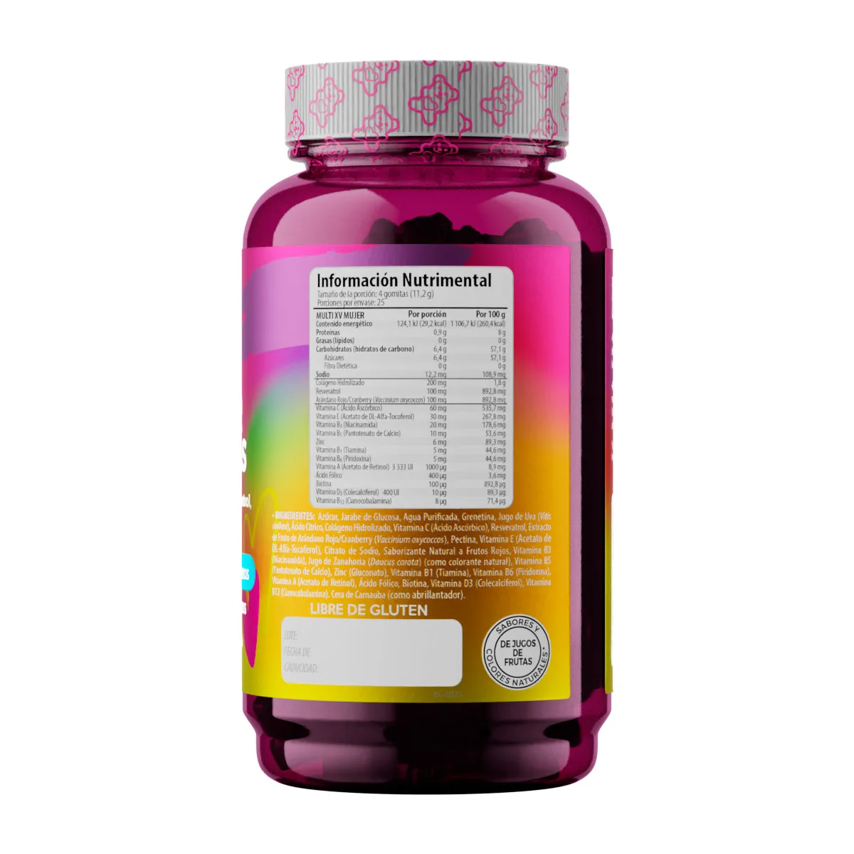 Gomitas para Adultos de: Vitaminas para Mujeres con Colágeno, Resveratrol, Arándano, Zinc, Ácido Fólico. Sabor Frutos Rojos.