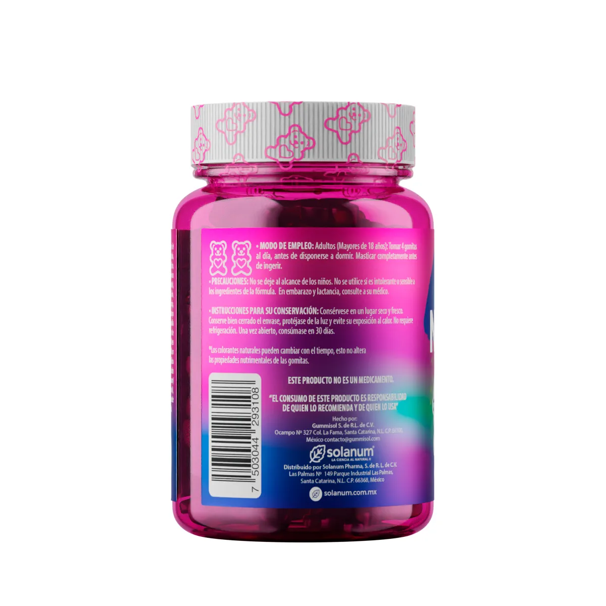Jarabe de Glucosa, Azúcar, Agua Purificada, Grenetina, Citrato de Magnesio, L-Teanina, Ácido Cítrico, Ácido Gama Amino Butírico (AGAB/GABA), Pectina, Citrato de Sodio, Saborizante Natural de Naranja, Extracto de [Azahares de Naranjo (Citrus sinensis), Flor de Manzanilla (Matricaria chamomilla), Flor de Húmulus (Humulus lupulus), Partes aéreas de Melissa (Melissa officinalis), Partes aéreas de Pasiflora (Passiflora incarnata)], Concentrado de Paprika (Capsicum annum) (como colorante natural), 5-Hidroxitriptófano (5-HTP), Cera de Carnauba (como abrillantador).