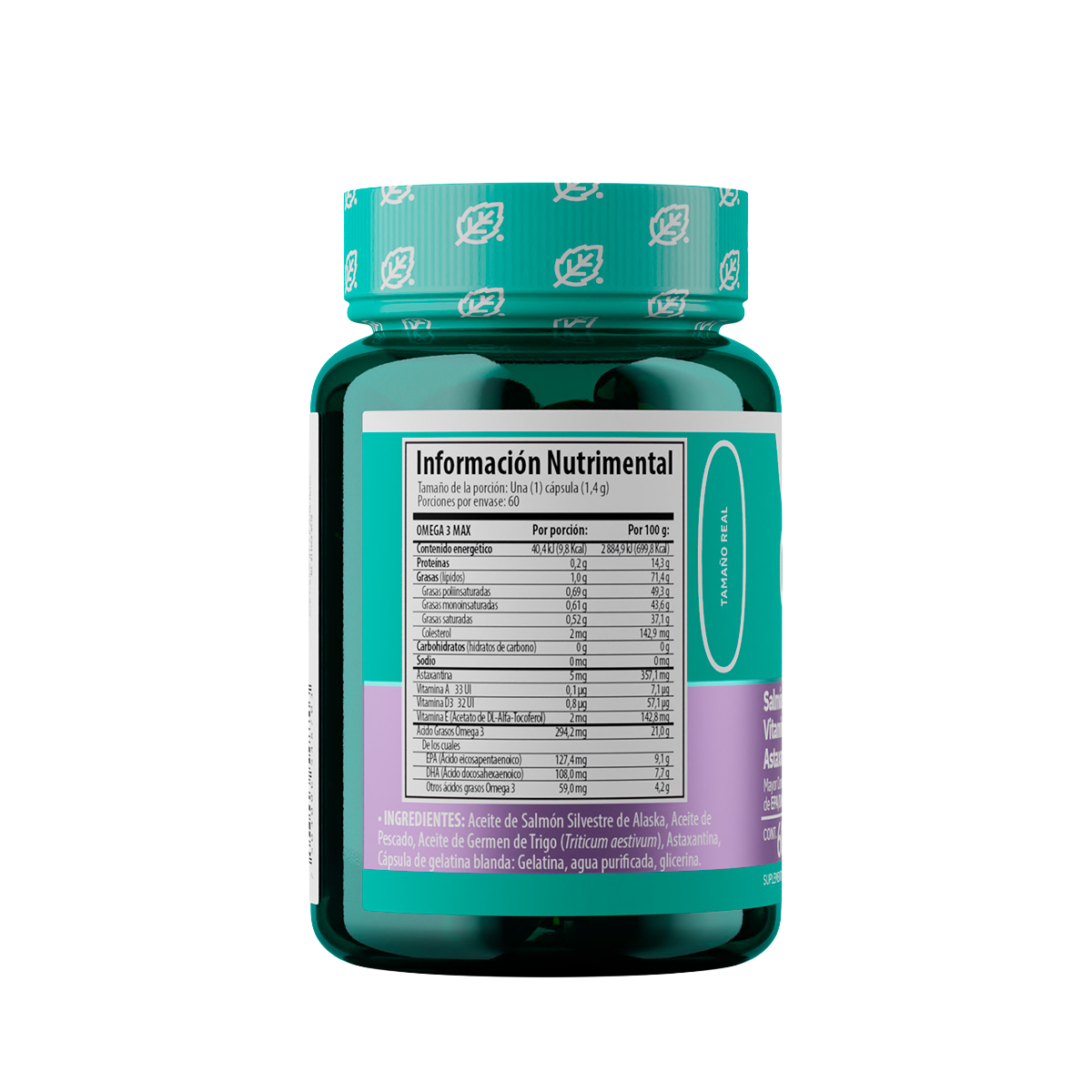 Cápsulas de Omega 3 de Salmón de Alaska, Vitaminas A, D, E y Astaxantina con mayor concentración de EPA/DHA.