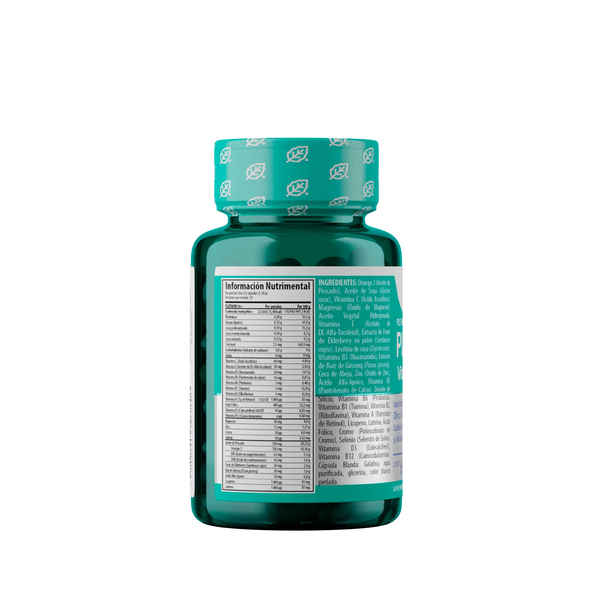 Omega 3 (Aceite de Pescado), Aceite de Soya (Glycine max), Vitamina C (Ácido Ascórbico), Magnesio (Óxido de Magnesio), Aceite Vegetal Hidrogenado, Vitamina E (Acetato de DL-Alfa-Tocoferol), Extracto de Fruto de Elderberry en polvo (Sambucus nigra), Lecitina de soya (Glycine max), Vitamina B3 (Niacinamida), Extracto de Raíz de Ginseng (Panax ginseng), Cera de Abeja, Zinc (Óxido de Zinc), Ácido Alfa-lipoico, Vitamina B5 (Pantotenato de Calcio), Dióxido de Silicio, Vitamina B6 (Piridoxina), Vitamina B1 (Tiamina), Vitamina B2, (Riboflavina), Vitamina A (Palmitato de Retinol), Licopeno, Luteína, Ácido Fólico, Cromo (Polinicotinato de Cromo), Selenio (Selenito de Sodio), Vitamina D3 (Colecalciferol), Vitamina B12 (Cianocobalamina). Cápsula Blanda: Gelatina, agua purificada, glicerina, color blanco perlado.