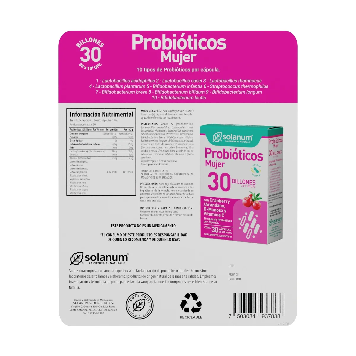 PROBIÓTICOS FOR WOMAN, es una fórmula que contiene 10 diferentes cepas de bacterias probióticas que ayudan a tratar problemas generales de la digestión; para el síndrome del colon irritable, para la inflamación del colon; entre otros, además por su composición de D- manosa y cranberry favorece a la salud de la mujer por su acción en apoyo a la salud del tracto urinario, al igual que favorecen el ambiente para la adecuada supervivencia de las bacterias probióticas.