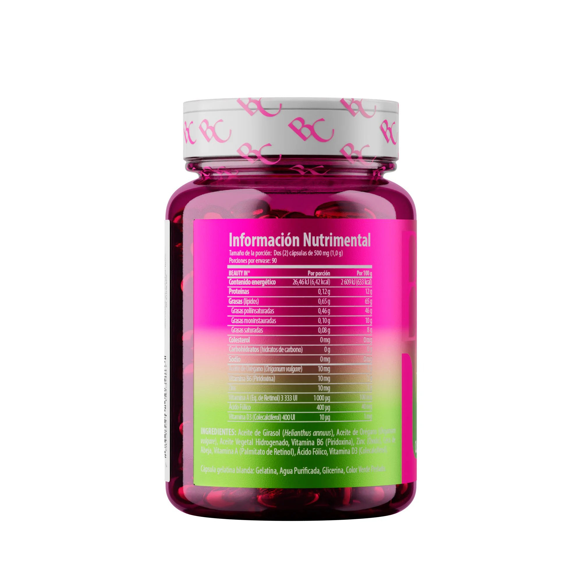 Aceite de Girasol (Helianthus annuus), Aceite de Orégano (Origanum vulgare), Aceite Vegetal Hidrogenado, Vitamina B6 (Piridoxina), Zinc (Óxido), Cera de Abeja, Vitamina A (Palmitato de Retinol), Ácido Fólico, Vitamina D3 (Colecalciferol). Cápsula gelatina blanda: Gelatina, Agua Purificada, Glicerina, Color Verde Perlado.