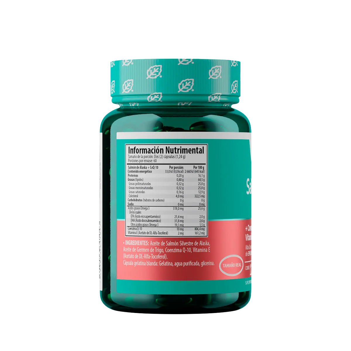 Aceite de Salmón Silvestre de Alaska, Aceite de Germen de Trigo, Coenzima Q-10, Vitamina E (Acetato de DL-Alfa-Tocoferol). Cápsula gelatina blanda: Gelatina, agua purificada, glicerina.