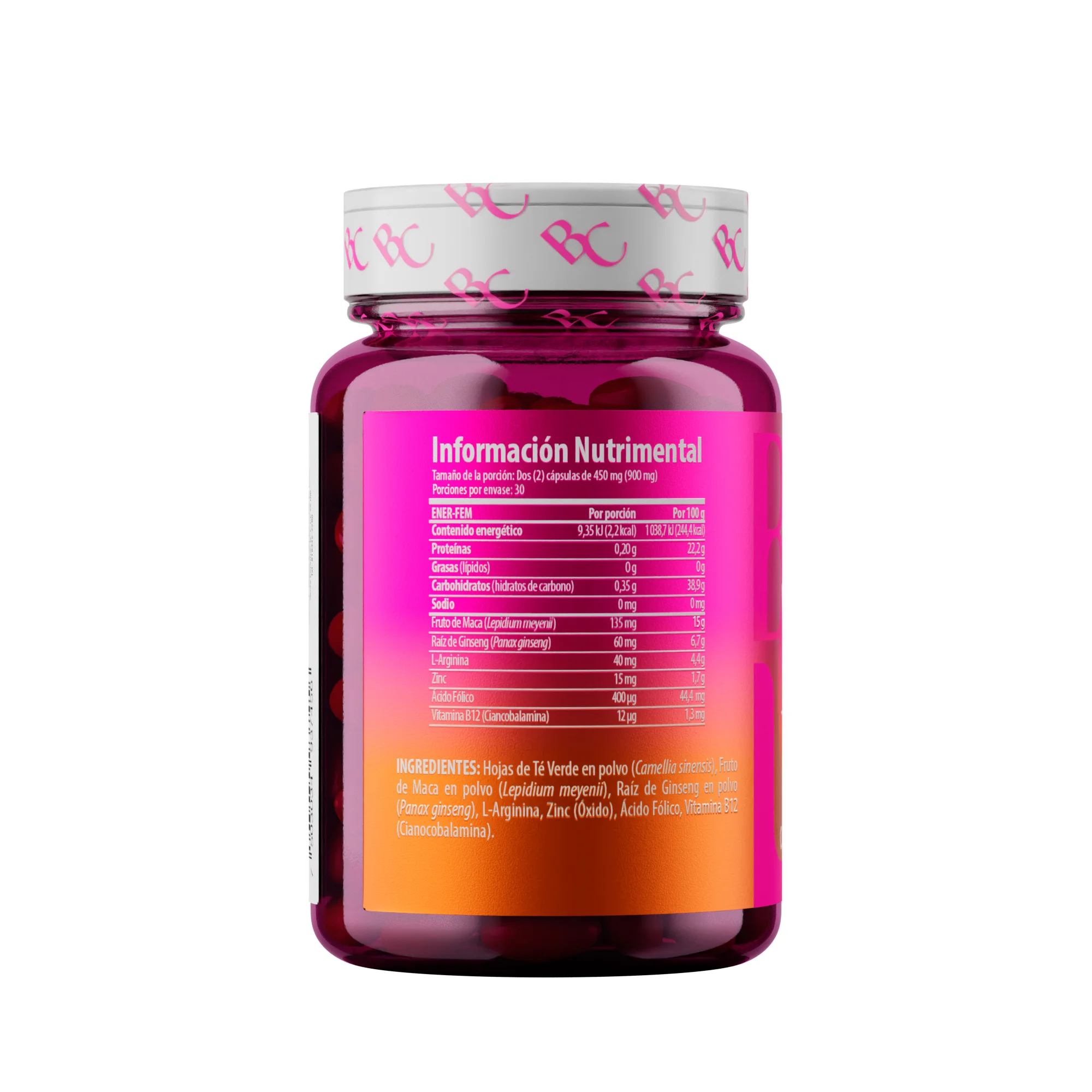 Hojas de Té Verde en polvo (Camellia sinensis), Fruto de Maca en polvo (Lepidium meyenii), Raíz de Ginseng en polvo (Panax ginseng), L-Arginina, Zinc (Óxido), Ácido Fólico, Vitamina B12 (Cianocobalamina).