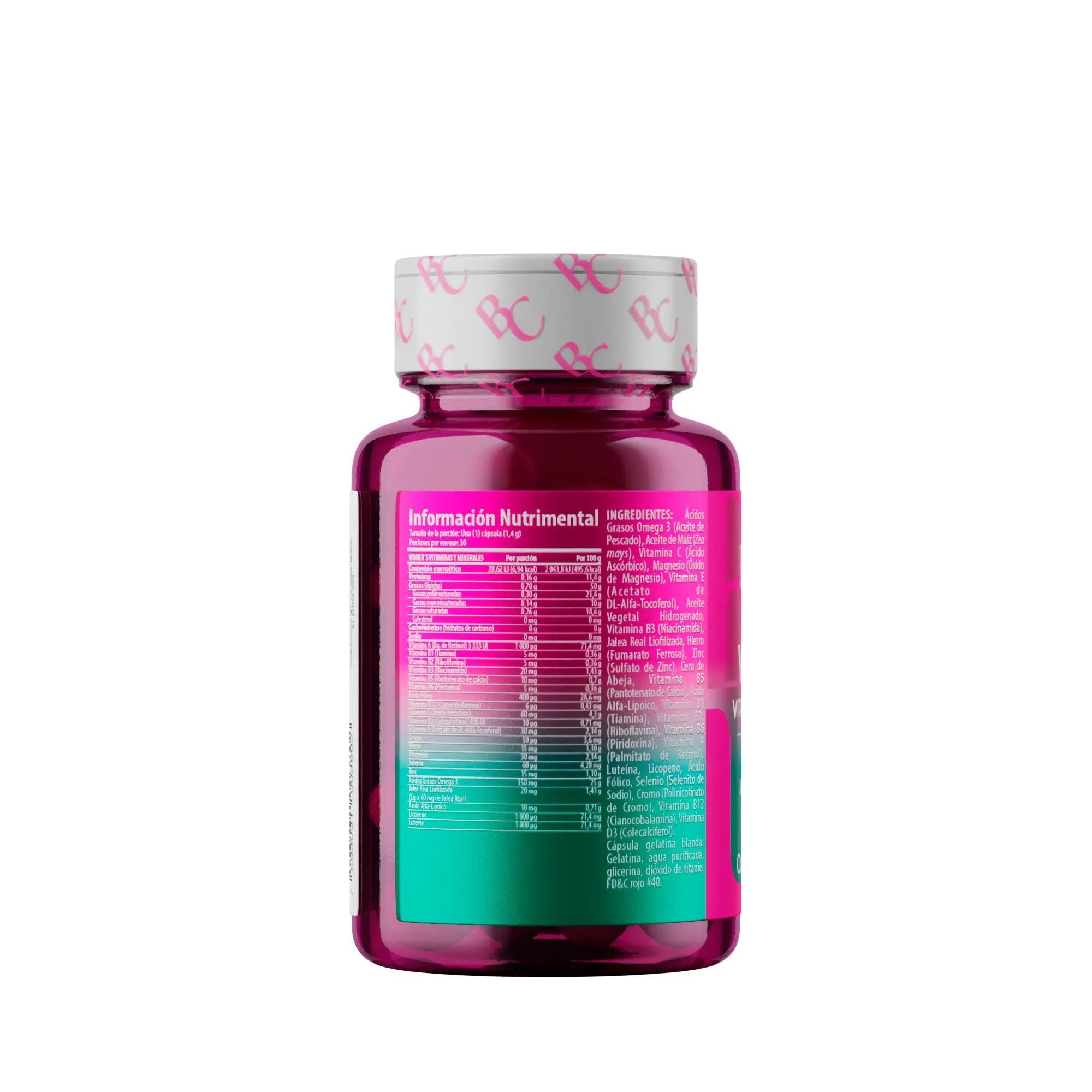 Ácidos Grasos Omega 3 (Aceite de Pescado), Aceite de Maíz (Zea mays), Vitamina C (Ácido Ascórbico), Magnesio (Óxido de Magnesio), Vitamina E (Acetato de DL-Alfa-Tocoferol), Aceite Vegetal Hidrogenado, Vitamina B3 (Niacinamida), Jalea Real Liofilizada, Hierro (Fumarato Ferroso), Zinc (Sulfato de Zinc), Cera de Abeja, Vitamina B5 (Pantotenato de Calcio), Ácido Alfa-Lipoico, Vitamina B1 (Tiamina), Vitamina B2, (Riboflavina), Vitamina B6 (Piridoxina), Vitamina A (Palmitato de Retinol), Luteína, Licopeno, Ácido Fólico, Selenio (Selenito de Sodio), Cromo (Polinicotinato de Cromo), Vitamina B12 (Cianocobalamina), Vitamina D3 (Colecalciferol). Cápsula gelatina blanda: Gelatina, agua purificada, glicerina, dióxido de titanio, FD&C rojo #40.