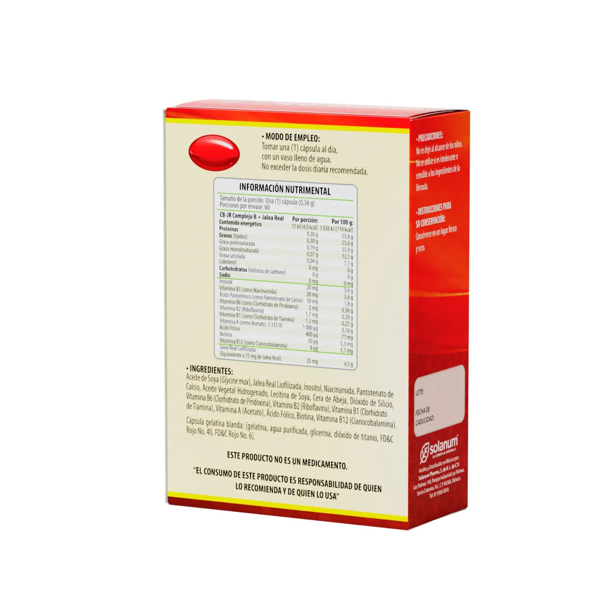 INGREDIENTES: Aceite de Soya (Glycine max), Jalea Real Liofilizada, Inositol, Niacinamida, Pantotenato de Calcio, Aceite Vegetal Hidrogenado, Lecitina de Soya, Cera de Abeja, Dióxido de Silicio, Vitamina B6 (Clorhidrato de Piridoxina), Vitamina B2 (Riboflavina), Vitamina B1 (Clorhidrato de Tiamina), Vitamina A (Acetato), Ácido Fólico, Biotina, Vitamina B12 (Cianocobalamina). Cápsula: [gelatina, agua purificada, glicerina, dióxido de titanio, FD&C Rojo No. 40, FD&C Rojo No. 6, metilparabeno, propilparabeno].